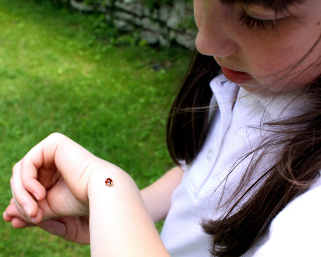 Anyway, we found this little lady in the garden earlier in the day. She was a truckin' it! We had trouble taking pictures because she had places to go, people to SEE, important engagements to attend to and all, don't you know. Julia loved it. She had the sweetest expression on her face--it was a look of wonder as she felt the ladybug's teeny-tiny feet tickling her arm.